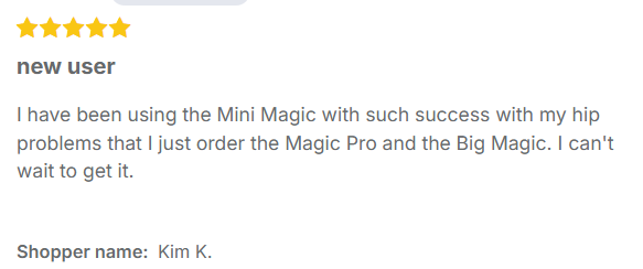 “I have been using the Mini Magic with such success with my hip problems that I just order the Magic Pro and the Big Magic. I can’t wait to get it.”